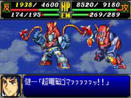 Voilà le second volet hors-série, après Masô Kishin sur SFC. Mais cette fois-ci, on est beaucoup plus proche d'un SRW classique, avec des robots en SD. Nous sommes fin 2002, SRW a donc bientôt 10 ans d'âge. Durant cette décennie, au fil des épisodes, Banpresto a donné naissance à de nombreux personnages originaux. Eh bien, ceux-ci existant désormais en nombre suffisant pour en faire un jeu a part entière, l'éditeur ne s'est pas privé de le faire ! On retrouve donc des persos comme Ryusei (Shin SRW), Masaki (tétralogie d'origine, Alpha et Maso Kishin), Kyosuke et Exellen (Impact), et plein plein d'autres ! Au début du jeu, on vous demande de choisir un héros principal entre Ryusei et Kyosuke (d'après un interview de Terada, l'impossibilité de pouvoir sélectionner Masaki de la même manière tient au fait que ce dernier a déjà droit à son propre jeu, à savoir Maso Kishin), ce qui changera radicalement une bonne moitié du soft, il faudra donc faire deux campagnes pour espérer en voir à peu près le tour.