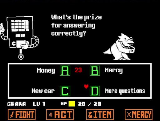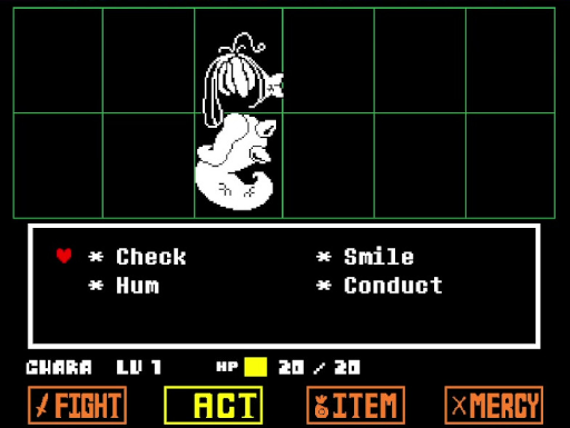 Prosaïquement, si l'on peut dire, MERCY est le choix moral : nous faisons le choix de résoudre la confrontation pacifiquement mais, en contrepartie, nous restons aussi faible qu'au début du jeu. FIGHT est le choix attendu : nous nous défendons et devenons plus fort, plus résistant, mais nous devenons un danger dans cet univers. Le choix est d'autant plus compliqué que choisir d'être pacifique est plus difficile, dans la mesure où nous devons à la fois résoudre l'énigme de la rencontre — quelle option du menu ACT permettra de gracier l'ennemi —, et rester en vie en esquivant les attaques avec une barre de vie qui n'augmentera jamais.