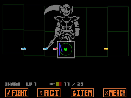 Les combats d'Undertale s'effectuent certes au tour par tour, mais ils ne sont pas passifs. Lorsque le monstre agit, nous sommes au contrôle de notre âme, représentée par un cœur rouge, et charge à nous de la contrôler et d'esquiver les projectiles lancés. Par endroit, le jeu se rapproche d'une sorte de shoot'em up et il faudra bien du talent, souvent, pour ne pas prendre des dégâts face aux attaques des monstres.
