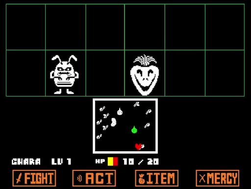 Les combats ressemblent assez à ceux d'Earthbound ou de Dragon Quest. Flowey la fleur, au début du jeu, vous initiera quant à elle aux rudiments de la chose, mais ses leçons sont à considérer prudemment...
