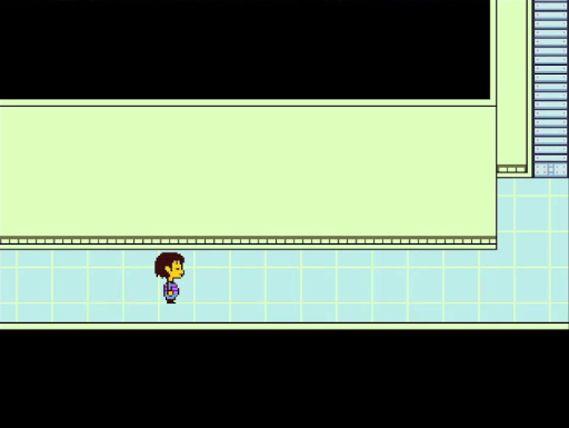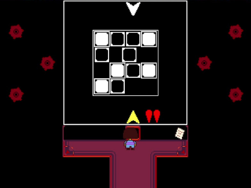La présentation ludique d'Undertale se segmente, comme nombre de J-RPG, en deux séquences clés : la séquence d'exploration, où l'on contrôle notre avatar sur l'aire de jeu en vue de dessus, parle aux personnages, récupère des objets et résout des énigmes, par exemple en activant des interrupteurs, et les séquences de combat. L'exploration n'est pas intrigante en elle-même, et nous n'avons pas à notre disposition de pouvoirs particuliers : on ne peut pas sauter ou détruire des objets, tout au plus peut-on pousser parfois un bloc ou une brique lorsque le jeu l'exige, aussi passerais-je rapidement ici.