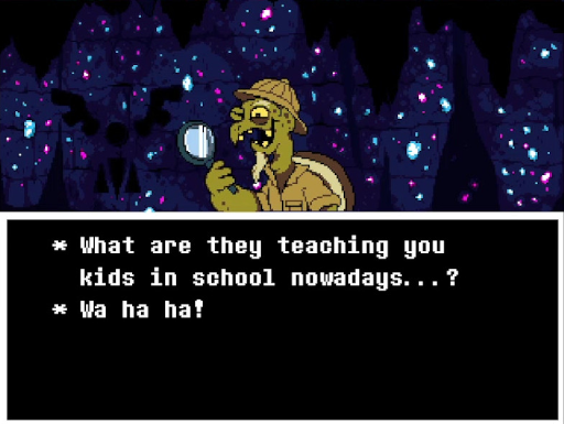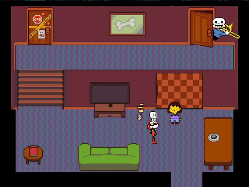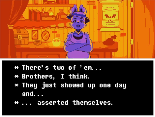 Sans (qui parle dans la police d'écriture « Comic Sans », ce qui explique son sens de l'humour) et Papyrus (qui parle, là encore, dans la police « Papyrus »), les deux frères squelettes, sont sans doute les personnages les plus populaires de la distribution. Le jeu est sinon tout imprégné de références à la culture japonaise, comme cet ennemi qui reprend le concept, bien connu des amateurs et amatrices, de la « Tsundere » (lien Wikipedia).