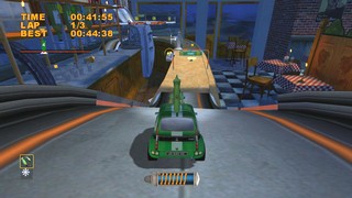 La période pré-estivale connait donc des hauts et des bas. Vont alors sortir coup sur coup trois jeux très attendus depuis leurs annonces respectives, et qui vont se révéler être trois surprises, puisque les jeux rétro vont se comporter d'une façon très différentes de l'habitude : - Commençons par Prince of Persia : Un classique créé sur Apple II en 1989 puis porté sur toutes les machines ou presque. Une énième émulation Live Arcade ? Non car le jeu a été intégralement refait en 3D (mais en gardant bien entendu la vue de profil). Les graphismes sont de toute beauté, l'ambiance sonore excellente, de nouveaux modes de jeux permettent de rejouer chaque niveau seul, incitant ainsi au time attack. En fait il ne manquait que le jeu original en bonus pour que l'offre soit parfaite. Prince of Persia prouve, tout comme Jetpac Refuelled peu avant, que jeu rétro ne rime pas forcément avec bête émulation. - Mad Tracks en revanche est une déception, en particulier pour ceux qui n'y avaient pas déjà goûté sur PC. Là ou beaucoup esperaient une ambiance à la Micro Machines et autres Toy Commander, le jeu se révèle être un enchaînement de courses qui se terminent trop vite, et de challenges très plaisants mais courts. Et on a vite fait le tour des 15 épreuves du jeu. La version PC en contient 45, mais sur XBLA les 30 épreuves supplémentaires sont sorties plus tard sous forme de packs payants. Certes, le prix total reste équivalent à celui de la version PC, mais le sentiment de s'être fait arnaquer si l'on n'avait pas lu "les petites lignes du contrat" avant l'achat gâche la fête... Le paradoxe, c'est que la pillule serait bien mieux passée si le jeu avait été directement vendu en entier à prix élevé, mais non seulement cela se révélait impossible du fait de la limite de taille des jeux XBLA (50Mo) qui venait certes de passer à 150Mo quelques semaines mais aurait obligé a retarder la sorti d'un jeu promis depuis déjà longtemps, et de toute façon psychologiquement, personne n'aurait acheté un jeu à 1500pts, bien qu'encore une fois la version PC se vende bien pour des conditions similaires... Nous reviendrons plus bas sur le ô combien délicat concept du contenu supplémentaire, ou DLC. - Enfin, Pac-Man Chanpionship Edition. Lui c'est un peu l'inverse de Mad Tracks. L'annonce de ce nouveau Pac-Man avait engendré beaucoup de méfiance, voire de sarcasmes. Nous nous sommes plusieurs fois attardés sur le phénomène Ms.Pac-Man du XBLA plus tôt dans ce dossier, et l'annonce d'un troisième opus, qui plus est un "Pac-Man en temps limité" était assez inquiétante. Au final cela donne bel et bien un nouveau Pac-Man, totalement axé sur le scoring et garni d'innovations. Une vraie bonne surprise dont on pourrait juste regretter le fait que le Pac-Man original ne soit pas livré avec en bundle ! Mad TracksPrix : 800 pts (9,30€) - Date de sortie : 30 mai 2007 Développeur : Load Inc. Un jeu dans lequel on pilote des voitures à friction sur des circuits improvisés par un gosse qui pourrait être celui qu'on a été, conjugant l'ambiance de Micro Machines, le gameplay de Mario Kart et des mini-jeux aussi variés et imaginatifs que ceux d'un Super Monkeyball, le tout jouable en ligne à 4 ou sur la même console, pas de doute : Mad Tracks comble un manque énorme sur le Xbox-Live. Développé dans des conditions artisanales par un studio français, ce jeu s'est longuement fait attendre, et en dépit de graphismes corrects sans plus et d'une musique ratée, il répond bien présent sur le plan du fun. "Incontournable" est donc le premier mot qui vient à la bouche... et tout s'effondre quand on apprend les termes de l'arn... euh, du contrat. En fait la version vendue pour 800pts ne comporte que 15 épreuves (6 courses et 9 mini-jeux) sur les 45 de la version sortie sur PC. Le reste arrivera par la suite sous la forme de deux packs DLC vendus 350pts pièce. Une limite est franchie : il ne s'agit plus de vendre du "contenu additionnel", c'est bien le matériau de base qui est coupé en tranches. Deuxième douche froide : le mode Live, totalement impraticable. Après chaque épreuve (soit toutes les 2-3mn), la partie est dissoute sans préavis car il n'y a pas de lobby, et les joueurs doivent se relancer des invitations. Un zéro pointé pour la convivialité, et un remède imparable contre la bonne humeur collective qu'un tel jeu est censé générer. Et pourtant on aurait tant aimé, par chauvinisme et envie de soutenir un studio qui fait ses débuts, défendre Mad Tracks avec ferveur.