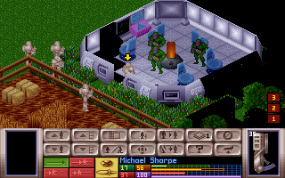 Score ? Effectivement. À la fin de chaque mission, vous obtiendrez une note pour la qualité de votre intervention. Absolument tout entre en ligne de compte dans l'appréciation finale : nombre d'aliens tués ou capturés, artefacts récupérés, agents X-Com tués, civils sauvés, et dans les cas les plus extrêmes, vaisseau X-Com perdu. Plus le score est élevé, plus la nation sera satisfaite de vos services. Avant d'aller disperser de l'alien, l'équipement des soldats est la première tâche qui vous incombe (et surtout qui vous décombe). Au début de chaque mission, vous devrez équiper chaque membre de l'escouade individuellement. Il est donc très important d'avoir mémorisé les spécificités de chaque soldat pour l'équiper en conséquence. Dans le doute, Power Armor - Heavy Plasma - Electroflares - Grenades - Médikits pour tout le monde fonctionnera très bien. La vue passe en tour par tour et 3D isométrique à plusieurs niveaux d'altitude, cet écran s'appelle le Battlescape. Détaillons la nouvelle interface : ![]() L'interface du Battlescape est très fournie. La vue 3D est séparée en niveaux visibles individuellement ou ensemble dans une vue complète. La vue par défaut cache tout se qui se situe au-dessus du niveau actuel, c'est pour ça que l'OVNI de la capture au-dessus ne semble pas avoir de toit, alors que c'est un gigantesque Battleship qui possède 3 étages supplémentaires. Cette vue est la plus pratique. De part et d'autre de l'interface se trouvent les cases qui symbolisent les mains de l'unité sélectionnée. La plupart des armes se portent à 2 mains avec une des cases vide. Les commandes tactiques se trouvent dans la partie supérieure : on y trouve pêle-mêle l'accès à la carte, la fin du tour, l'inventaire des soldats, le bouton pour faire accroupir les hommes... Je m'abstiendrai de vous détailler chaque bouton et chaque fonction, sinon cet article va se transformer en guide de l'utilisateur. Tout en bas de l'interface, vous trouverez les 4 boutons de déplacement (déplacement jusqu'à épuisement des unités de temps, laisser la possibilité d'un tir simple, visé, ou un tir auto), puis les informations détaillées sur le soldat sélectionné : grade, nom, unités de temps, fatigue, santé et moral. Le champ de bataille est un endroit extrêmement dangereux, puisque les aliens ne se contentent pas de rester sagement dans leur vaisseau : ils sont partout ! Plus le crash est violent, moins il restera d'aliens vivants (et moins vous aurez de matériel à récupérer). La première phase de jeu consistera à faire sortir vos hommes du vaisseau, ce qui donne souvent lieu à de précoces fusillades. À la manière des "Boys" débarquant sur Utah Beach en 44, tous les soldats passant dans le champ de vision d'éventuels aliens vont se faire copieusement arroser. Première constatation, le jeu gère la vue de vos troufions, à l'instar de Commandos. Au début, toute la carte est recouverte d'un Fog of War petit-à-petit révélé. Il est extrêmement important de faire pivoter vos hommes sur eux-mêmes le plus possible, car un alien situé dans une zone d'ombre ou un angle mort (même à une case du soldat) ne sera pas détecté. De nuit, la vision de vos troupes sera diminuée (le cône de vision portera moins loin), les Electroflares (réutilisables) seront alors indispensables pour y voir plus clair. Anecdote amusante : le jeu peut être joué en anglais, français ou allemand intégral. En français, les Electroflares se nomment "Leurres Electroniques", et c'est seulement en passant le jeu en anglais que j'ai compris à quoi servaient ces bidules... et je n'ai plus jamais rejoué en français ! ![]() ![]() Cette partie du jeu se révèle incroyablement tactique, car il faut avoir un œil partout (surtout en missions de terreur ou à l'intérieur des OVNIs), couvrir chaque parcelle de terrain et chaque homme sous peine de voir la situation dégénérer rapidement. Lorsque tous vos hommes sont Rookies, la perte d'un seul d'entre eux engendrera une réaction en chaîne : un soldat paniqué peut soit courir en laissant tomber son arme, soit ne pas pouvoir bouger, soit devenir fou et tirer partout. Il m'est déjà arrivé de perdre 5 hommes à la suite parce que j'avais eu un mort au début du tour... Les gradés apparaissant, les crises de folie sont moins fréquentes. Le plus rigolo, c'est que passé un certain point, les rôles s'inverseront et les aliens paniqueront à leur tour ! Certaines races aliennes sont plus dangereuses que d'autres : la plupart est relativement facile d'élimination (Snakeman, Cyberdisc, Floater, Celatid, Muton, etc.), mais d'autres sont nettement plus retorses, notamment à cause de leur capacités Psi (Commandant Sectoïd, Ethereals, Chyssalid). Les commandants Sectoïd sont d'autant plus dangeureux qu'on les rencontre très tôt dans le jeu, les attaques Psi pouvant entraîner la panique de la cible, voire même leur contrôle pur et simple ! Dans ce cas, il vous faudra tuer le soldat contrôlé par vos ennemis. Les missions de récupérations d'OVNIs sont particulièrement rébarbatives, car pratiquement identiques malgré la génération aléatoire des cartes. Les attaques de bases Aliennes, la défense de vos propres installations et les missions de Terreur sont plus captivantes, mais trop rares. Un tout petit mot sur la partie sonore du jeu : si les effets sonores sont rares et assez quelconques, la musique est un bonheur. Les mélodies sont simples et répétitives, mais très oppressantes et toujours dans le ton. J'ai été agréablement surpris lorsque j'ai appris que c'était John Broomhall (le compositeur des musiques de Transport Tycoon) qui les avait écrites. ![]() ![]() Au gré de mes pérégrinations sur le Web, j'ai trouvé un excellent guide stratégique ultra complet sur le jeu. Vous le trouverez sur cette page. Il est ultra complet, très détaillé, donne une foultitude d'infos, et m'a bien aidé à 